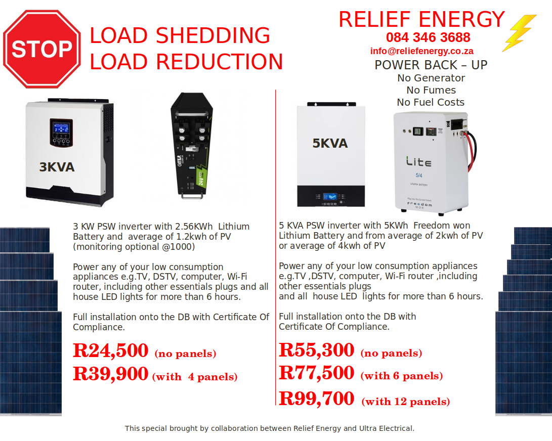 You can contact us at info@reliefenergy.co.za or 084 346 3688 for more information.